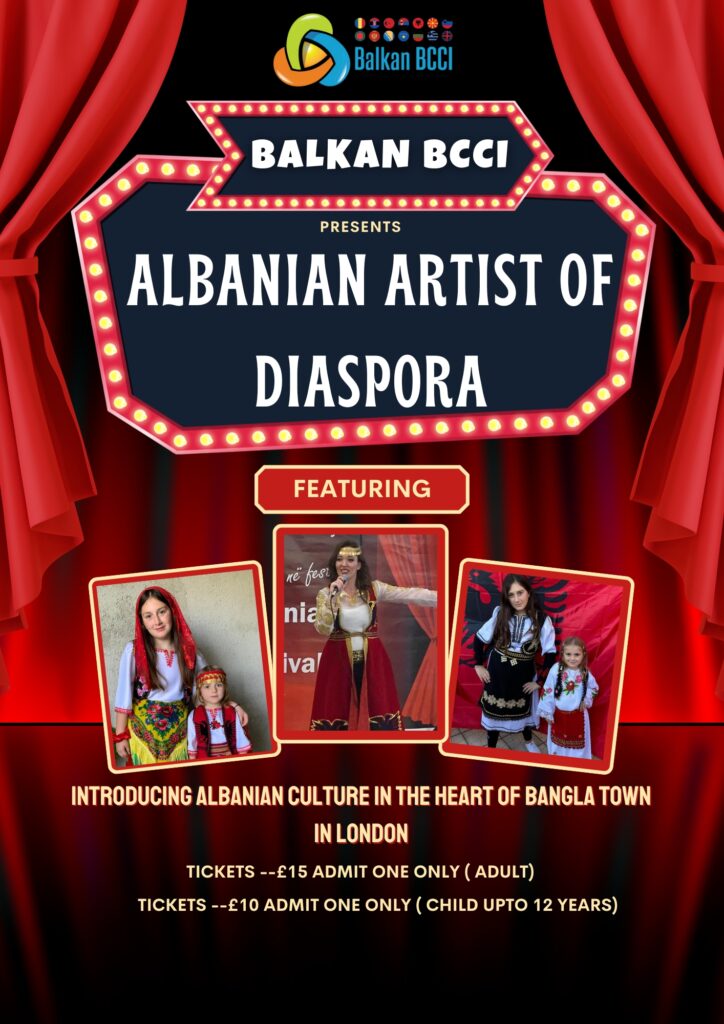 Join us for a vibrant cultural experience as we proudly present “Albanian Artist of Diaspora”, a spectacular event celebrating Albanian heritage, music, and traditional artistry—right in the heart of Bangla Town, London!